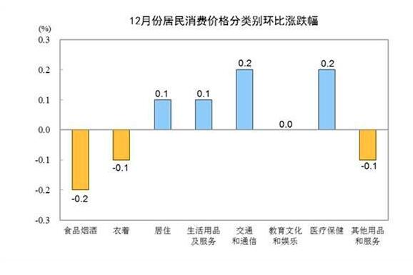 12月份,全國居民消費價格環比持平。其中,城市持平,農村下降0.1%;食品價格下降0.4%,非食品價格上漲0.1%;消費品和服務價格均持平。