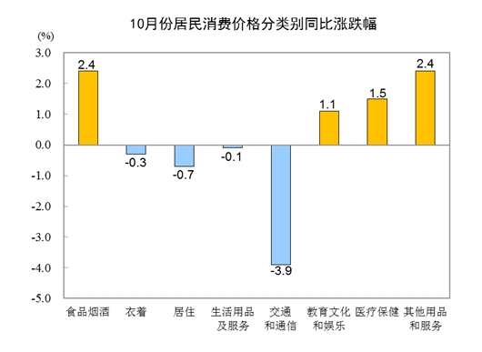 10月份,全國居民消費價格環比下降0.3%。其中,城市下降0.3%,農村下降0.5%;食品價格下降1.8%,非食品價格上漲0.1%;消費品價格下降0.6%,服務價格上漲0.1%。