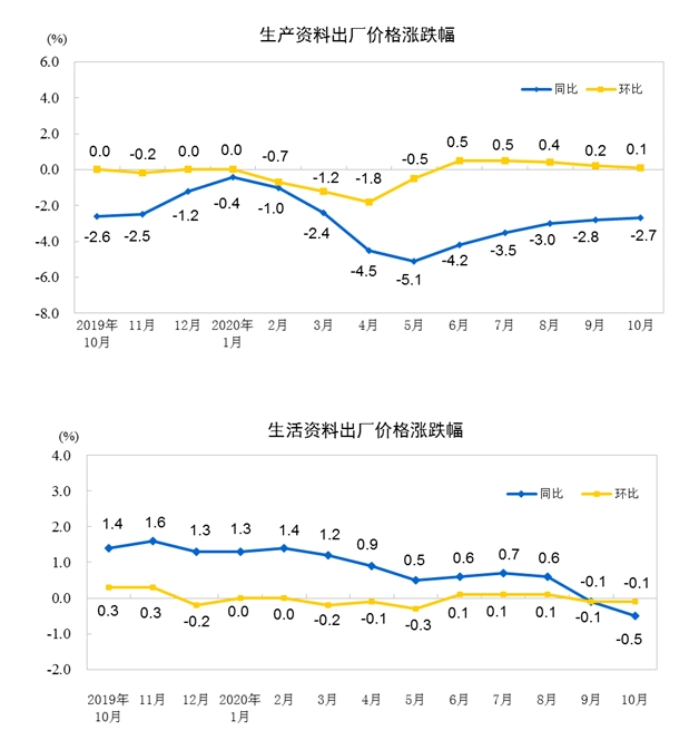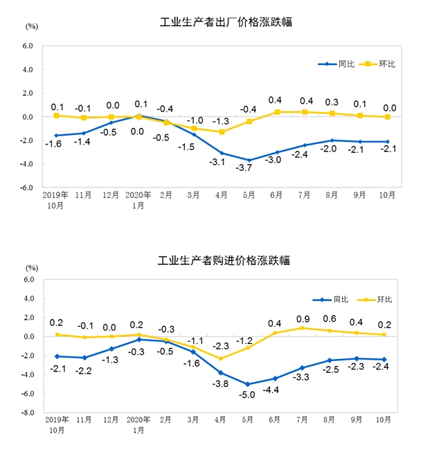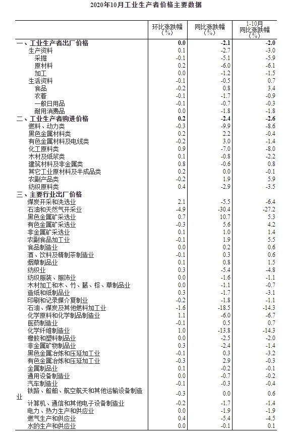 2020年10月份,全國工業生產者出廠價格同比下降2.1%,環比持平;工業生產者購進價格同比下降2.4%,環比上漲0.2%。1―10月平均,工業生產者出廠價格比去年同期下降2.0%,工業生產者購進價格下降2.6%。