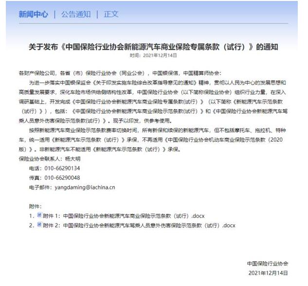 通知稱,該《條款》包括《中國保險行業協會新能源汽車商業保險示范條款(試行)》和《中國保險行業協會新能源汽車駕乘人員意外傷害保險示范條款(試行)》。