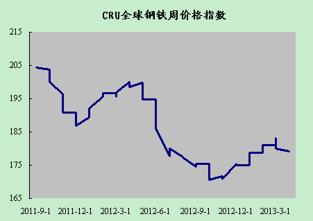 本周國際鋼市疲軟。CRU國際鋼價綜合指數為179.1。本周CRU扁平材指數為171.4,CRU長材指數為194.5。其中,歐洲市場CRU價格指數為175.7,北美市場CRU價格指數為165.1,亞洲市場CRU價格指數為189.2。