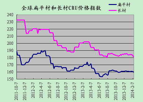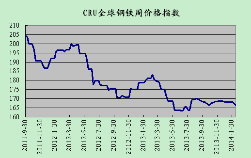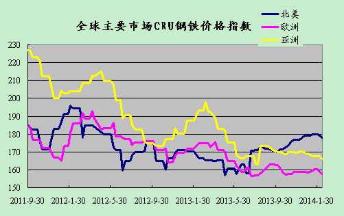 上周國際鋼市整體走低。CRU國際鋼價綜合指數為166.46,CRU扁平材指數為159.91,CRU長材指數為181。其中北美市場CRU價格指數為177.87,歐洲市場CRU價格指數為157.83,亞洲市場CRU價格指數為166.14。