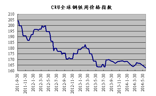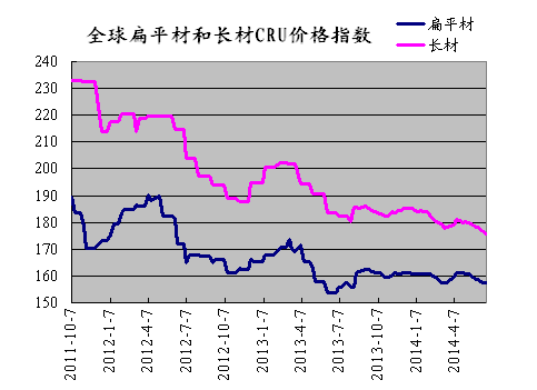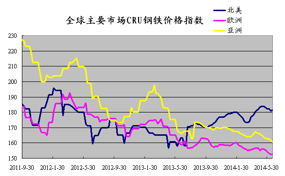 上周國際鋼市繼續全面走低。CRU國際鋼價綜合指數為162.79,CRU扁平材指數為157.32,CRU長材指數為175.71。北美市場CRU價格指數為181.4,歐洲市場CRU價格指數為152.49,亞洲市場CRU價格指數為160.72。