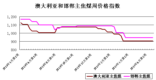 截至2014年6月第4周,澳大利亞主焦煤價格指數為905,與前一周相比持平;與此同時,中國邯鄲主焦煤價格指數為945,與前一周相比持平。