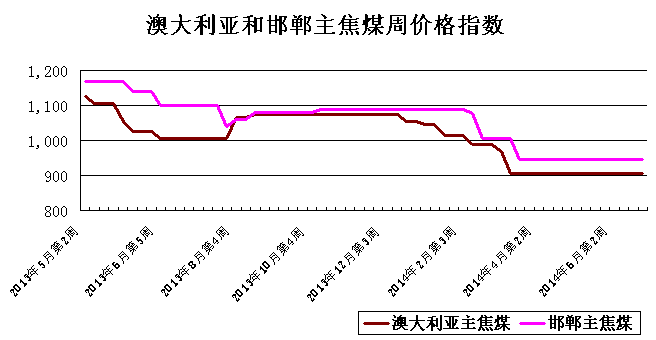 截至2014年7月第1周,澳大利亞主焦煤價格指數為905,與前一周相比持平;與此同時,中國邯鄲主焦煤價格指數為945,與前一周相比持平。