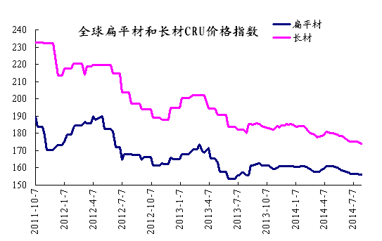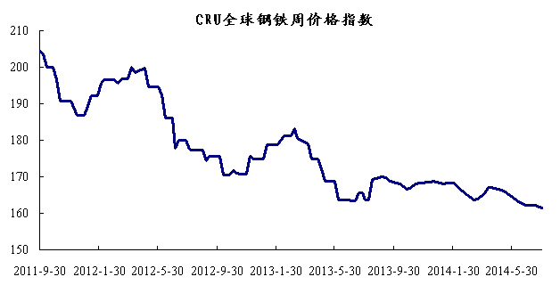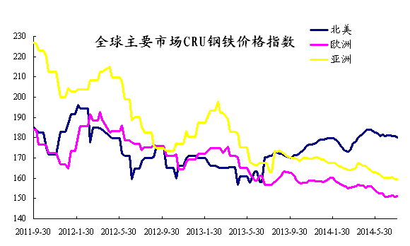 上周國際鋼市整體走低。CRU國際鋼價綜合指數為161.42,CRU扁平材指數為156.11,CRU長材指數為174.06。北美市場CRU價格指數為179.97,歐洲市場CRU價格指數為151.05,亞洲市場CRU價格指數為159.63。