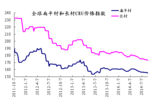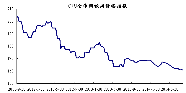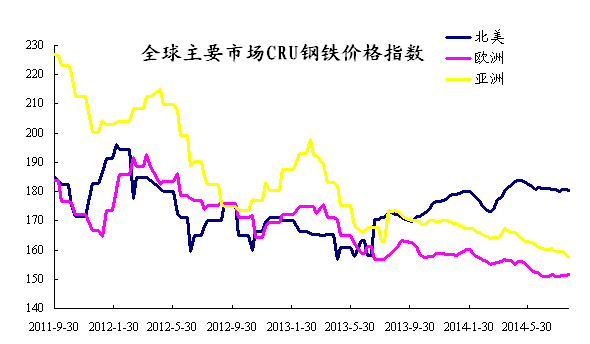 上周國際鋼市整體下滑。CRU國際鋼價綜合指數為160.59,CRU扁平材指數為155.2,CRU長材指數為173.32。北美市場CRU價格指數為180.31,歐洲市場CRU價格指數為151.67,亞洲市場CRU價格指數為157.48。
