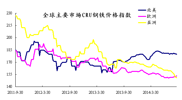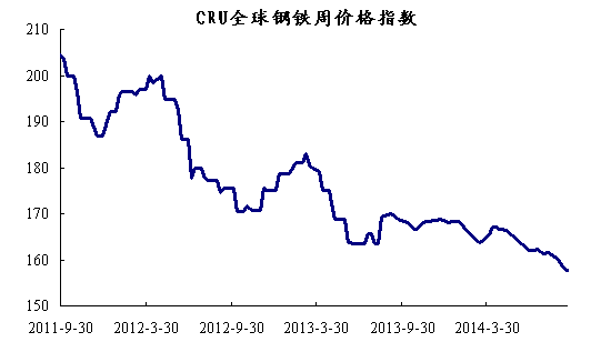 上周國際鋼市持續整體走低。CRU國際鋼價綜合指數為157.74,CRU扁平材指數為152.94,CRU長材指數為169.56,北美市場CRU價格指數為179.64,歐洲市場CRU價格指數為153.25,亞洲市場CRU價格指數為151.08。