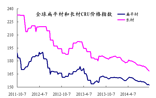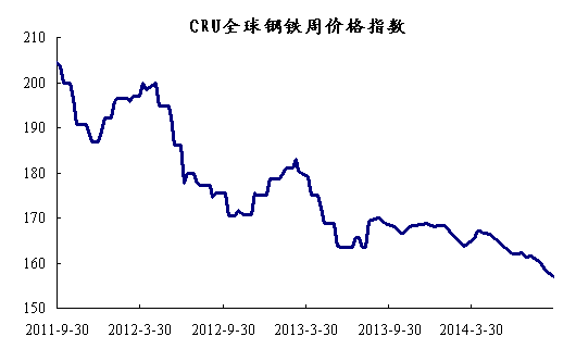 上周國(guó)際鋼市繼續(xù)整體走低。CRU國(guó)際鋼價(jià)綜合指數(shù)為156.96,CRU扁平材指數(shù)為152.929,CRU長(zhǎng)材指數(shù)為168.57,北美市場(chǎng)CRU價(jià)格指數(shù)為179.74,歐洲市場(chǎng)CRU價(jià)格指數(shù)為153.62,亞洲市場(chǎng)CRU價(jià)格指數(shù)為149.23。