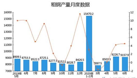 據世界鋼鐵協會統計數據, 2020年上半年全球粗鋼產量為8.731億噸,同比下降6.0%。2020年6月全球粗鋼產量為1.483億噸,同比下降7.0%。其中2020年6月我國粗鋼產量9158萬噸,同比增長4.5%;1-6月粗鋼產量49901萬噸,同比增長1.4%。